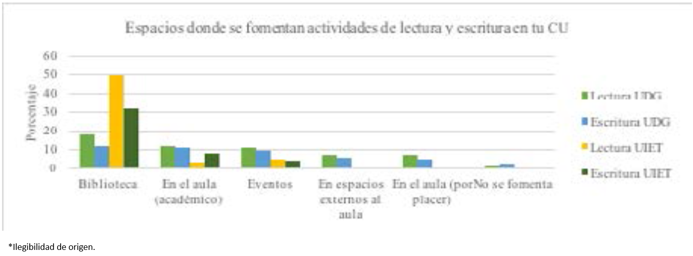 Factores institucionales de acceso. Al cuestionar sobre las maneras en que se fomenta la lectura/escritura en sus universidades (Figura 3), en ambas IES se observó que el espacio principal para promover estas prácticas es la biblioteca. La diferencia es que en la UDG también fueron respuestas frecuentes el aula y los eventos, lo que implica que tienen mayor exposición a la promoción de prácticas de lectura que sus pares de la UIET.