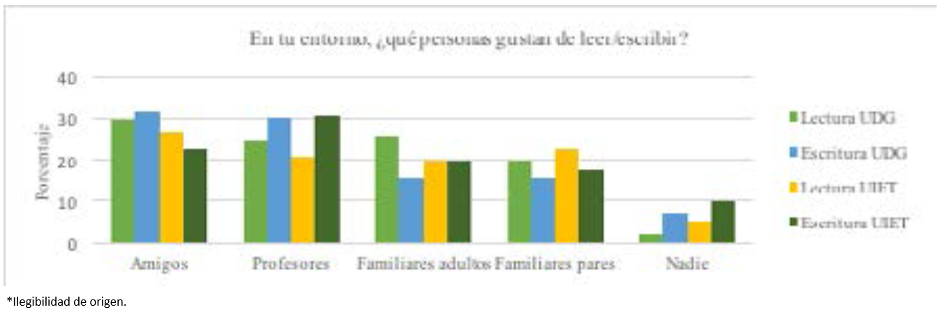 También se indagó sobre qué personas cercanas a ellos muestran un agrado por la lectura y la escritura. En la UDG prevalecieron las amistades y los familiares adultos en ambas prácticas; mientras que en la UIET, en la lectura prevalecieron las amistades y en la escritura se reportó que el profesorado el que más los anima a hacerlo por placer (Figura 5). Por tanto, se observa que en UDG las prácticas de lectura y escritura se transmiten entre pares, mientras que en la UIET las de escritura se comparten de una persona más experimentada al estudiante.