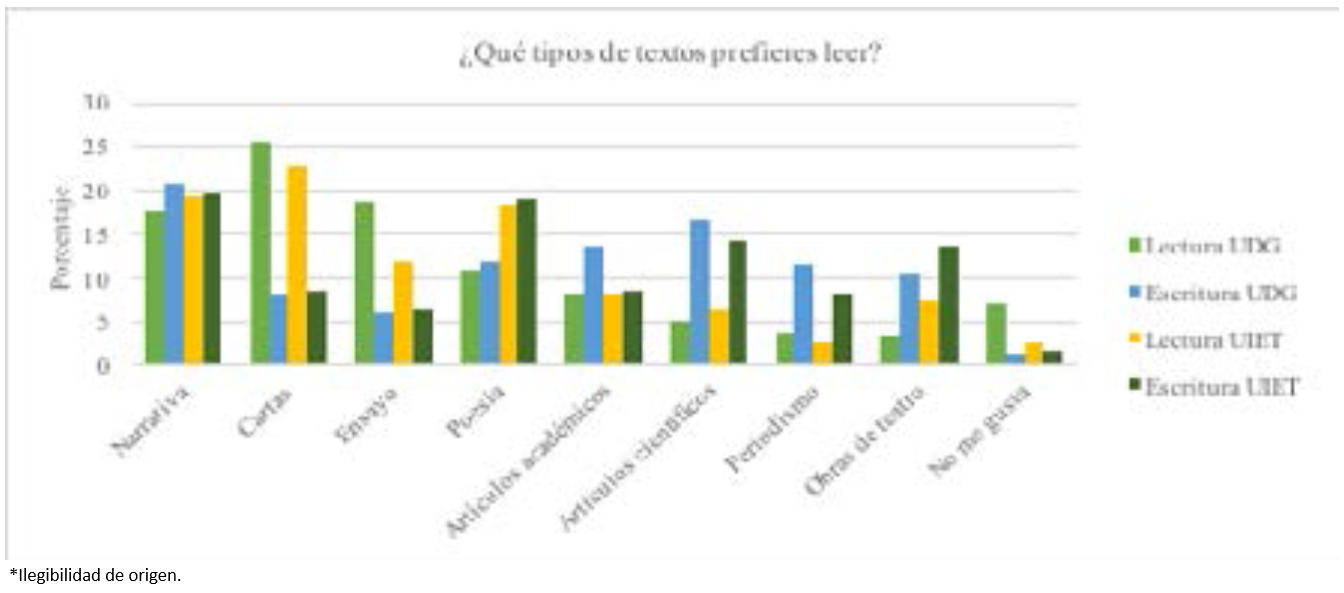 En relación con las estrategias cognitivas de lectura y escritura, se sondeó sobre sus intereses o preferencias individuales. Los estudiantes de la UDG reportaron que los textos que más les gusta leer, en orden de preferencia, son cartas, ensayos y narrativa; en tanto que en la UIET prefieren las cartas, la narrativa y la poesía. Y en lo que se refiere a la escritura, en la UDG se inclinan más por los textos narrativos, los artículos científicos y académicos, así como la poesía y el periodismo; y en la UIET les agrada más escribir narrativa, poesía, artículos científicos y obras de teatro (Figura 6).