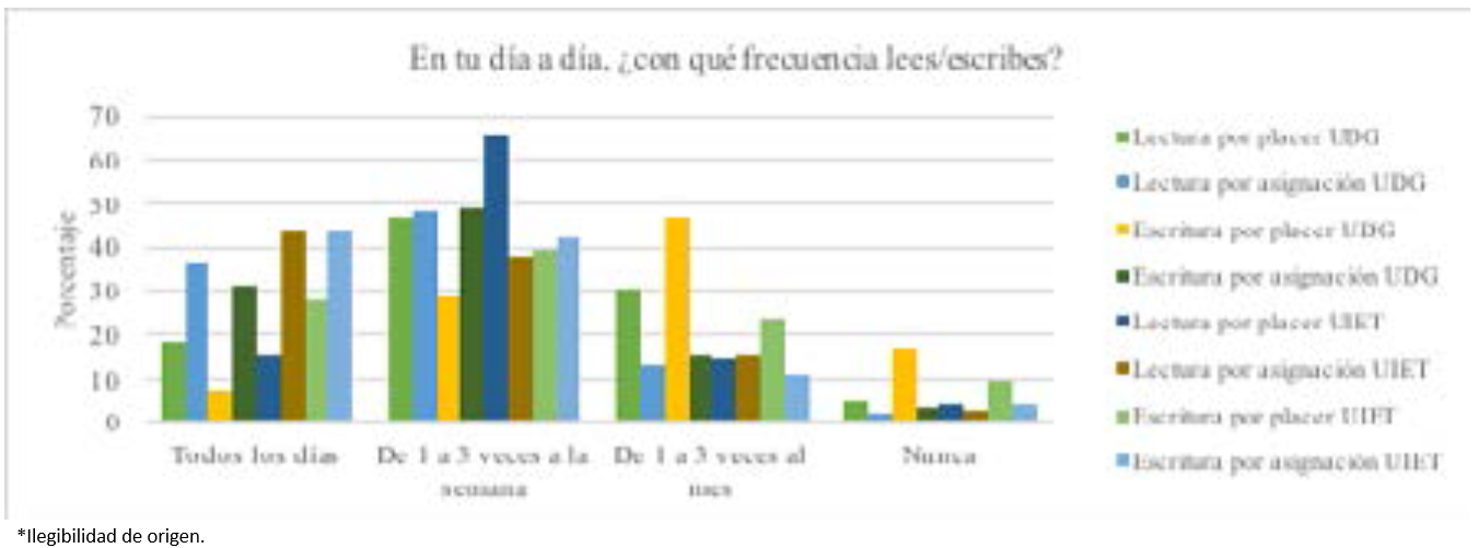 Figura 7 Frecuencia de lectura y escritura del estudiantado de la UDG y la UIET
