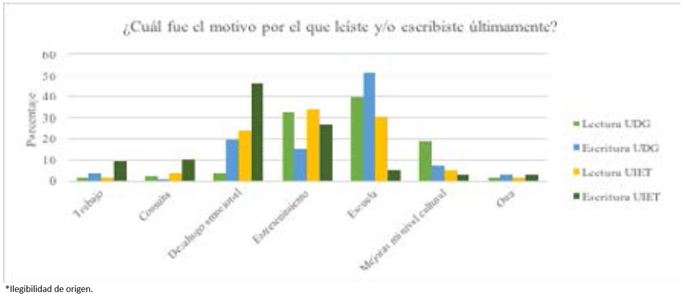 En relación con lo anterior, las personas encuestadas de la UDG apuntaron a que últimamente leyeron, en primer lugar, porque lo requieren para sus actividades escolares y, en segundo, por entretenimiento; en tanto que en la UIET leyeron por en primer lugar por entretenimiento, y en segundo por requerimiento de la escuela. Y respecto a la escritura, en la UDG reportaron que primordialmente lo hacen en la escuela, en tanto que en la UIET la razón principal es el desahogo emocional (Figura 8).