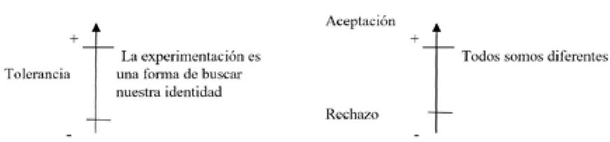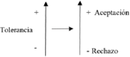 Como se puede observar, las escalas argumentativas explican esquemáticamente la lógica y los argumentos del mensaje persuasivo. Consideramos que la capacidad representativa de las escalas argumentativas es de gran utilidad puesto que puede ayudar a visualizar las relaciones internas de las actitudes implícitas; en nuestro caso concreto hablamos de las relaciones entre la tolerancia y la aceptación. Como hemos expresado al inicio, las actitudes implícitas son herramientas conceptuales que posibilitan a los sujetos emitir juicios sobre los objetos de actitud. Lo anterior supone la convivencia armónica en diferentes grados (cf. Gawronski, Bodenhausen, 2014) de las distintas actitudes implícitas, de manera que se puedan conjugar en razonamientos. Las estructuras argumentativas también pueden combinarse entre ellas, dando lugar a lo que Ducrot llama un topos (cf. Ancombre, Ducrot, 1994: 19 y 208). El topos (topoi en plural), desde Aristóteles es interpretado como una información aceptada por un colectivo que fundamenta y da sentido a una argumentación. Para Ducrot, el topos es analizable como un razonamiento lógico interiorizado con garantía de validez, que permite vincular argumentos y conclusión, cuyo origen es una relación estrecha de dos escalas argumentativas. Por estas razones, vemos en el concepto de topos una representación esquemática más amplia y explicativa, tanto en el nivel del enunciado como en el de las actitudes, que nos permite especular sobre la influencia de las actitudes implícitas en las verbalizaciones de los sujetos. En esta lógica, el topos del mensaje persuasivo, que suponemos refuerza las actitudes implícitas de los adolescentes fomentadas por el discurso escolar, puede sintetizarse en el siguiente el razonamiento: “entre mayor sea la tolerancia, mayor será la aceptación”; y su opuesto: “a menor tolerancia, mayor será su rechazo” (Figura 2).