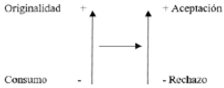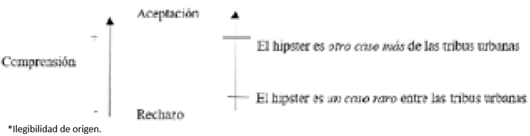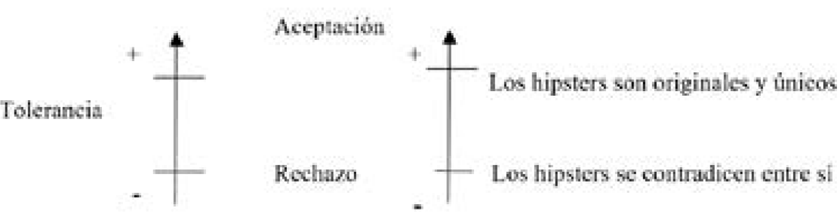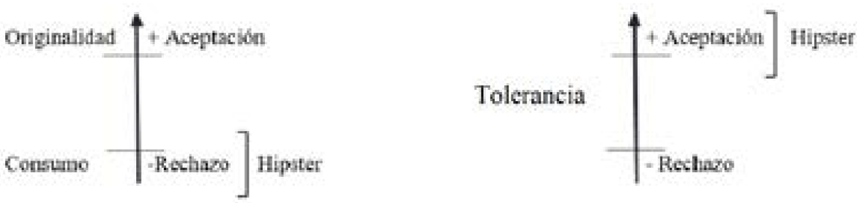 Se observa la semejanza entre las Figuras 3 y 2 pues comparten la escala argumentativa de aceptación-rechazo. Sin embargo, la Figura 3, ahora, en lugar de asociarse con la escala de tolerancia, lo hace con una de originalidad, cuyo extremo opuesto dentro de su universo textual es el consumo. De esta forma, el texto postula una tesis con un razonamiento en el cual la aceptación o el rechazo es proporcional al grado de originalidad de los sujetos. Por consiguiente, es lícito aceptar tanto las manifestaciones de originalidad de los sujetos como rechazarlos justo en la medida en que carecen de ella, y se caracterizan por el mero consumo. Entonces, como el topos es la garantía que otorga la validez al argumento y los hipsters son un mero producto de consumo, por lo tanto, es legítimo rechazarlos.
