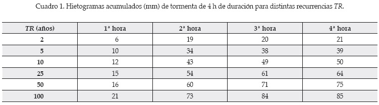 Considerando que el 75% de las tormentas presenta duraciones iguales o menores a cuatro horas y que para duraciones mayores la frecuencia disminuye notablemente (Consorcio Inconas Latino Consult, 1988), los valores de precipitación para distintas recurrencias según el modelo de la ecuación (2) se observan en el cuadro 1.
