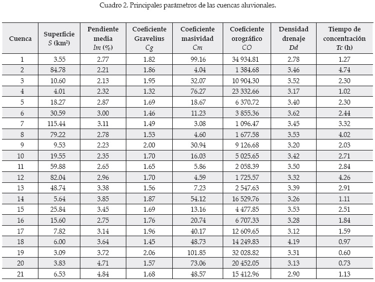 La secuencia metodológica consiste en aplicar al MDT las extensiones Spatial Analyst, Hydro y HECGeoHMS (USACE, 2003) del SIG ARCVIEW, para delimitar e identificar dentro de la zona de análisis las cuencas donde se presenta el fenómeno aluvional y las respectivas redes de drenaje. Este procesamiento permite, además, obtener un conjunto de parámetros morfométricos, físicos de forma y parámetros relativos a la red de drenaje utilizados en la caracterización de las cuencas. Entre ellos se pueden citar coeficiente de Gravelius, coeficiente de masividad, densidad de drenaje, pendiente media del cauce y tiempo de concentración.
