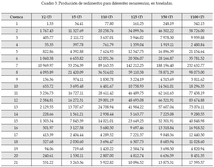 El factor C distribuido obtenido a partir del NDVI se observa en la figura 7. Se adoptó un valor de 1 para el factor P, dado que en las cuencas aluvionales no se practican actividades de conservación (Rapacioli, 2007). La producción de sedimentos para cada cuenca y recurrencia se observa en el cuadro 3.