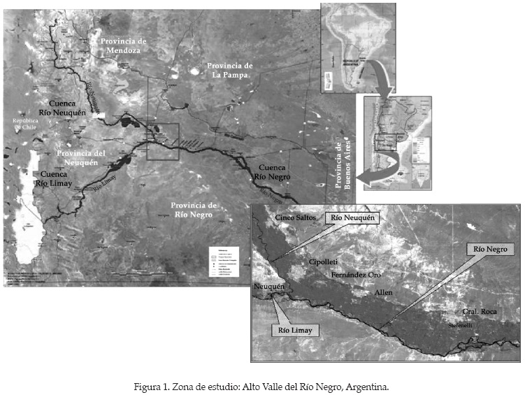 La zona de estudio, denominada Alto Valle del Río Negro, en la Norpatagonia Argentina, se trata de una unidad económica-productiva que abarca partes de las provincias del Neuquén y Ro Negro (67° 19' y 68° 06' longitud oeste, y 45', y 39° 07 latitud sur.). Este área, de aproximadamente 2 900 km2, incluye las localidades de Allen, Cinco Saltos, Cipolletti, Fernández Oro, General Roca y Stefenelli, en la provincia de Río Negro, y parte de la ciudad de Neuquén, en la provincia del mismo nombre. Se trata de un valle de formación sedimentaria, surcado por los ríos Limay y Neuquén, cuya confluencia da origen al río Negro. El clima es continental, templado y árido, con una precipitación media anual de 188 mm y heladas primaverales. Las precipitaciones son de origen convectivo, caracterizándose por su gran intensidad, corta duración y escasa cobertura areal. Los vientos predominan del cuadrante oeste y sudoeste, con mayor frecuencia en primavera-verano. Los suelos son típicos de desierto; se caracterizan por su baja meteorización de origen coluvional, de texturas no muy pesadas, entre arenosos y franco limosos, escasos en materia orgánica (<1%), con velocidad de infiltración media a alta y con un perfil profundo, sin gran desarrollo edáfico. El relieve es mesetiforme, con superficies topográficas escalonadas. Existen zonas escarpadas con relieve abrupto o anguloso. Se distingue la presencia de superficies subhorizontales planas, generadas a partir de la erosión de las sedimentitas cretácicas, hasta alcanzar un nivel de mayor resistencia. Las geoformas mayores se presentan con diverso grado de disección, donde se evidencia desde líneas de escurrimiento hasta cárcavas y cursos aluvionales de mayor envergadura.