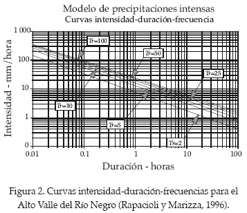 La figura 2 muestra las curvas intensidad-duración-frecuencia obtenidas con el modelo adoptado.