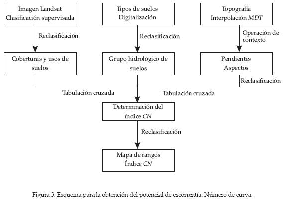 Posteriormente se obtuvo el CN requerido para la modelación hidrológica integrando el SIG (ARC VIEW) con el HEC-HMS. El índice CN indica el potencial de escorrentía del suelo; se consideró la condición I de humedad antecedente (suelo totalmente seco) y su determinación se realizó de manera distribuida mediante álgebra de mapas y reclasificaciones digitales de los mapas de cobertura y uso del suelo, grupos hidrológicos de suelos, pendientes y aspectos u orientaciones. Las operaciones se presentan en el diagrama de flujo de la figura 3.