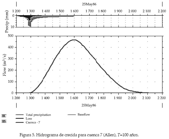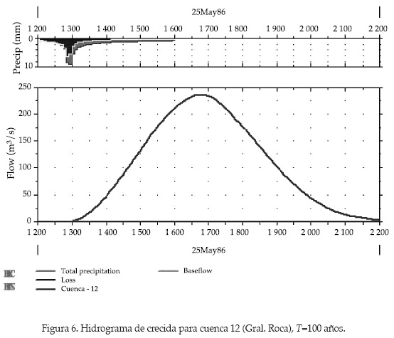 La aplicación del modelo HEC-HMS se basó en un modelo de cuenca obtenido a partir del HEC GeoHms sobre la base del MDT, considerando cada cuenca de manera independiente, con un valor de CN ponderado de acuerdo con el área de la misma y obtenido a partir de la figura 4. No se consideró flujo base, puesto que interesaba conocer el flujo superficial que aporta el mayor volumen de escorrentía. Se obtuvieron los hidrogramas de crecidas, de donde se desprenden los valores de V y Qp para recurrencias T= 2, 5, 10, 25, 50 y 100 años. A modo de ejemplo, las figuras 5 y 6 muestran los hidrogramas con caudales pico para TR=100 años de 464.65 y 235.22 m3/s para las cuencas 7 y 12, respectivamente.