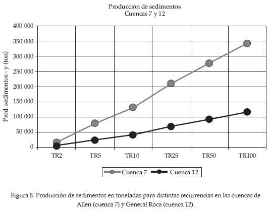 Las precipitaciones intensas de recurrencia de 10 años o más generan crecidas aluvionales de gran magnitud, movilizando grandes cantidades de sedimentos que se depositan en la parte inferior del sistema de cuencas, cambiando con frecuencia la fisonomía del sector. De acuerdo con las simulaciones, la dinámica hídrica de las cuencas 7 y 12 impacta fuertemente en los núcleos urbanos de las ciudades de Allen y General Roca, respectivamente. La magnitud de los sedimentos que se movilizan queda explícita en la cuenca número 7, que afecta la ciudad de Allen. La figura 8 muestra que para una crecida de 25 años de recurrencia con Qmáx, de 298.86 m3/s, se movilizan 209 336 toneladas de sedimentos.