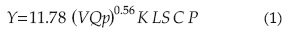 El volumen de escorrentía, V, se estima mediante el modelo de lluvia efectiva basado en el método del Número de Curva (CN) desarrollado por el U.S. Soil Conservation Service (USDA, 1972) y el cálculo del caudal máximo, utilizando el modelo basado en el hidrograma unitario. El factor de escorrentía α(VQp)β representa la energía usada en los procesos de desprendimiento y transporte de las partículas. La variable V está relacionada con los procesos de desprendimiento y Qp define el transporte de sedimentos (Williams y Berndt, 1977).
