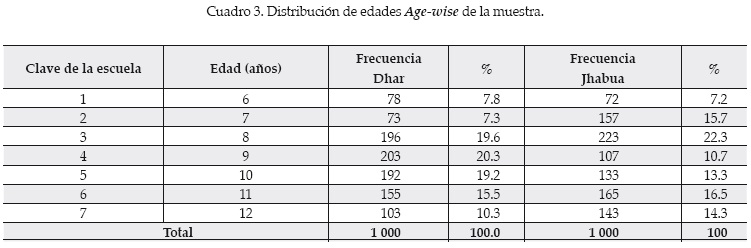 El cuadro 2 muestra el número total de estudiantes considerados en los distritos de Dhar y Jhabua (mil en total para cada caso). Para Jhabua se selección como número máximo 342 en Kalidevi y mínimo 19 en Rajla. En Dhar, el máximo fue de 180 para Kakalpura y el mínimo de 40 tanto en Teetipura como Kheri. El cuadro 3 muestra la distribución por sexo de la población en estudio. De un total de mil estudiantes, 448 (44%) eran hombres y 552 mujeres (55%). La distribución por edades se muestra en el cuadro 3: 8 y 11 años máximo, y 6 años mínimo.