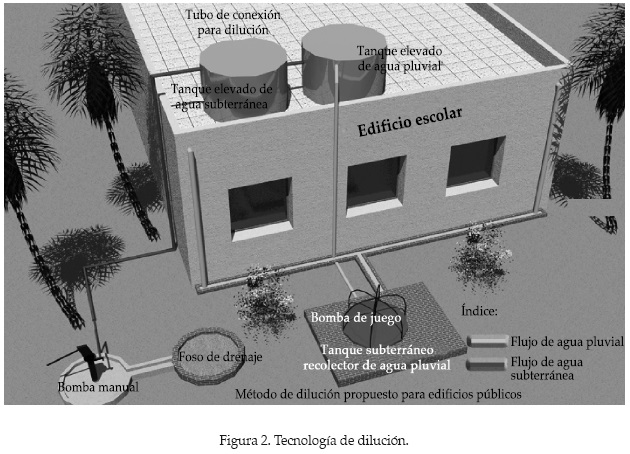 Intervenciones en el agua. La dilución del agua que provenía del acuífero se efectuó al colectar el agua de lluvia en techos. La mezcla se llevó para obtener en el agua de consumo una concentración de fluoruros de 1 mg/l. El principio de este trabajo se basó en que, en lugar de usar el enfoque convencional (con un reservatorio de descrate), emplear el agua de lluvia como fuente de suministro; debido a que ésta no era suficiente para atender todas las necesidades, se propuso su empleo como agua de dilución de la fracción que se emplea para consumo humano. Un esquema de la técnica empleada para diluir el agua se encuentra en la figura 2. El proceso de dilución se llevaba a cabo en tal forma que es posible realizar una dilución hasta de 1:2 para reducir el contenido original de fluoruros de agua de 3 a 1.5mg/l. En el ámbito local, el proceso se llevó a cabo en simples tinacos.
