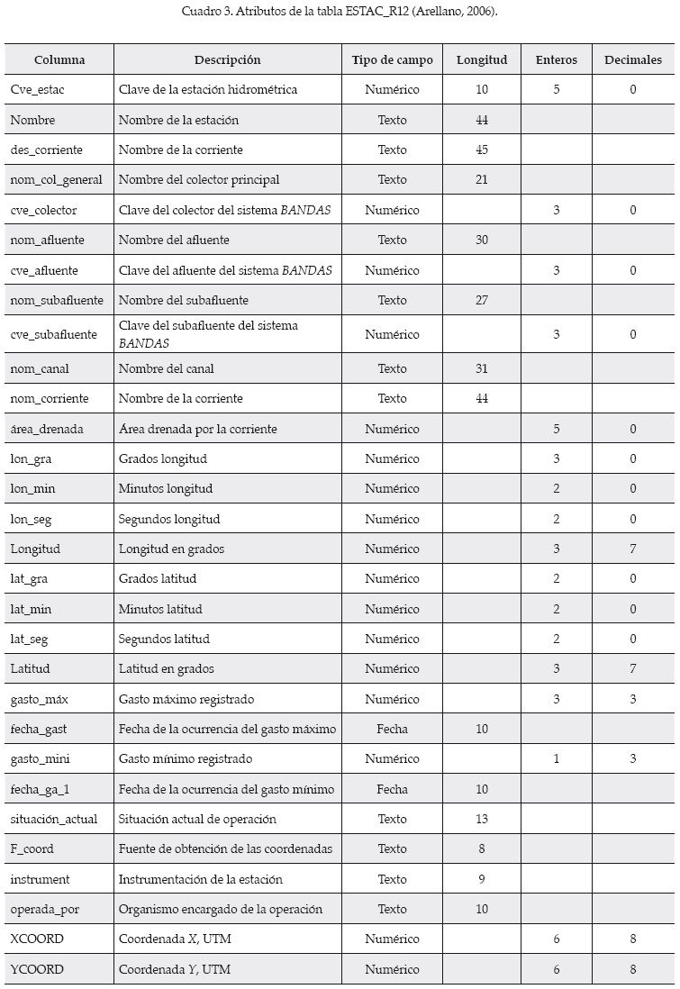 La ejecución del programa "Regionalización" fue diseñada para utilizar simultáneamente una base de datos hidrométricos, así como la cartografía correspondiente a cuencas y subcuencas. La base de datos implementada en Access comprende dos tablas relacionadas entre sí, una de las cuales, denominada ESTAC_R12, almacena la información de las estaciones hidrométricas, la cual se ligó con el archivo shape del mapa digital de las estaciones hidrométricas a través del campo que contiene la clave de la estación. La tabla llamada GASTOS_COMP contiene las series de tiempo de los gastos relacionados espacialmente. La figura 2 muestra el modelo entidad-relación de la base de datos hidrométricos y en el cuadro 3 se presentan los atributos de la tabla ESTAC_R12.