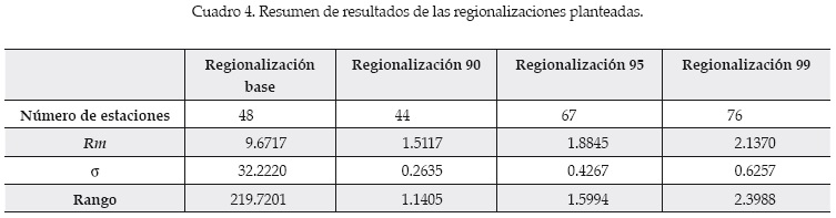 Los resultados obtenidos de la aplicación del filtro a diversosnivelesdeconfianzageneran regiones homogéneas de mayor extensión en general. Así, el número de estaciones en la región homogénea resultó ser de 44, 67 y 76 para 90, 95 y 99%, respectivamente. El resumen de resultados de cada región se presenta en el cuadro 4. En él se incluyen, además, el valor de la relación media Rm, la desviación y el rango.