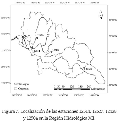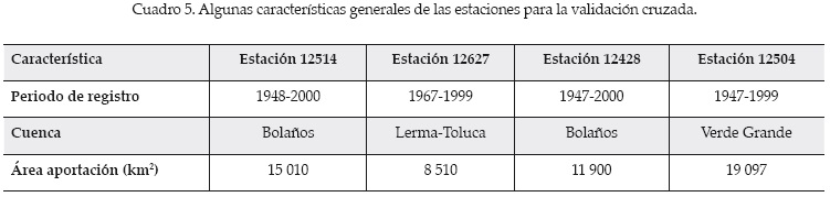 La validación de los resultados se realizó aplicando el método de la avenida índice para las regionalizaciones planteadas. Se eligieron en forma aleatoria las estaciones 12514, El Caimán; 12627, Pasarela Solís; 12428, Bolaños; y 12504, La Cuna. Estas estaciones cuentan con registros, por lo cual es posible realizar estimaciones de gastos sin necesidad de técnica regional alguna. Para este caso, dichas estimaciones se obtuvieron mediante un análisis de frecuencias, ajustando la función de distribución Gumbel. Esa es precisamente la fortaleza de la validación cruzada, pues permite comparar los estimados regionales con los estimados puntuales en cuencas aforadas, al considerarlas hipotéticamente como no aforadas. En el ejemplo se realizaron estimados para los gastos de 20, 50 y 100 años de periodo de retorno. La estimación a periodos de retorno mayores no es recomendable para cuencas no aforadas, utilizando métodos basados en regionalización. Los datos generales de las estaciones se presentan en el cuadro 5 y la ubicación de éstas se tienen en la figura 7.