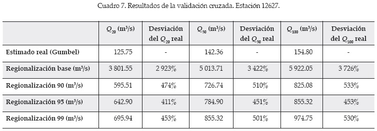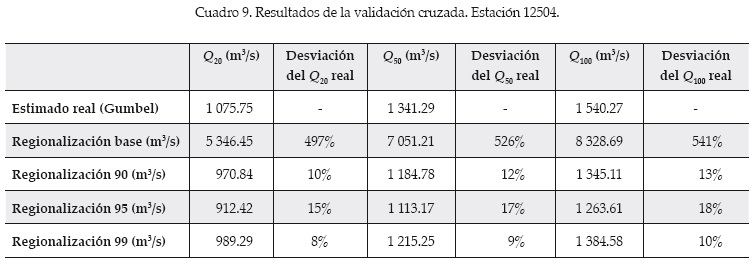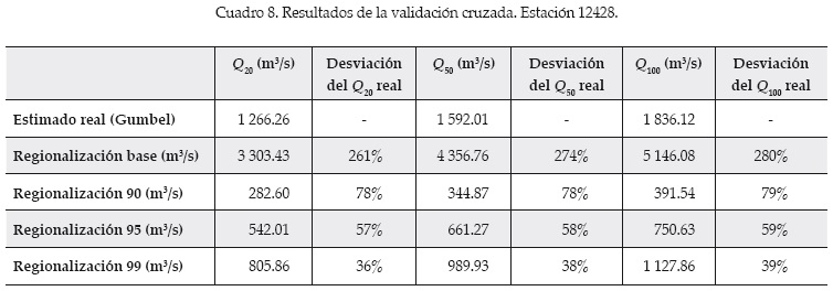 Una vez que se han obtenido las regiones homogéneas para cada uno de los niveles de confianza seleccionados, es posible comprobar, mediante una validación cruzada, la calidad de los estimados. Así, se propone realizar el estimado en cualquiera de las estaciones pertenecientes a la región homogénea, bajo la hipótesis de que no se conoce su gasto, y estimando éste a partir de la curva regional de frecuencias, y la (o las) características fisiográficas de la cuenca.