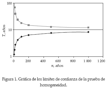 La gráfica, resultado de la prueba de homogeneidad, se obtiene llevando a un papel semilogarítmico los valores de n y T de las curvas de los límites superior e inferior. En la forma convencional, los valores del periodo de retorno se grafican en escala logarítmica sobre el eje de las ordenadas (figura 1).