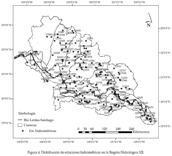 La prueba de la hipótesis planteada se realiza mediante la aplicación del procedimiento a la Región Hidrológico-administrativa XII, Lerma-Santiago, en la república mexicana. Esta región, una de las más importantes en México, tiene una extensión de 134 581 km2 y es drenada principalmente por los ríos Lerma y Santiago; en ella se encuentra el lago de Chapala, el cuerpo de agua más grande del país. El sistema Lerma-Santiago tiene un curso aproximado de 1 194 km desde el Estado de México hasta su desembocadura en Nayarit. La dirección predominante del escurrimiento en la cuenca es del oriente, con elevaciones de hasta 4 400 msnm al occidente. Para efectos de su manejo hidrológico, la región ha sido dividida en 12 subcuencas.