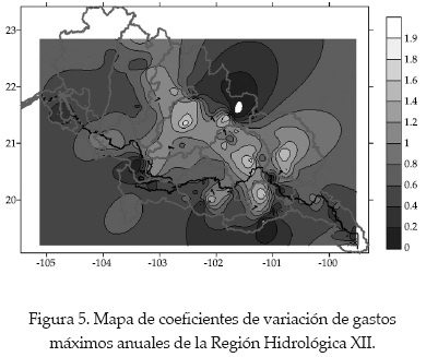 Con la finalidad de tener un análisis preeliminar de la variación de los gastos máximos dentro de la zona de estudio fue construido el mapa de los coeficientes de variación (CV), que se muestra en la figura 5. En este mapa de CV se observó que las variaciones máximas se presentan por lo general en las partes altas de las subcuencas debido muy probablemente a la mayor dispersión de estaciones hidrométricas en estas zonas. Asimismo, se encontró que el río Lerma-Santiago, casi en todo su trayecto, pasa por las zonas de CV menores de 1, lo cual corresponde a una menor dispersión de los gastos, además de mayor densidad de estaciones en las zonas cercanas al río.