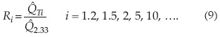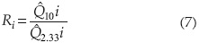 Para cada estación de la región se calcula la relación entre el gasto para el periodo de retorno base (10 años) y la avenida índice (T=2.33 años), y se asigna a cada una de ellas la relación Ri (ecuación (7)).