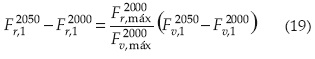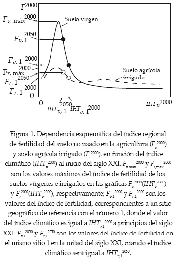 Donde Fr,12000 y Fr,12050 representan los índices regionales de fertilidad del suelo irrigado en el sitio de referencia con el número 1 al inicio y mitad del siglo XXI, correspondientes al cambio del índice climático de IHTv,12000 a IHTv,1205°; Fv,máx2000 y Fr,máx2050 son los índices de fertilidad del suelo virgen en el mismo sitio de referencia al inicio y mitad del siglo XXI, respectivamente. Los índices climáticos IHTv2000 e IHTv2050 se calculan con la ecuación (1). Fv,máx2000 y Fr,máx2000 corresponden a los valores máximos del índice de fertilidad de los suelos vírgenes e irrigados en las gráficas Fv2000(IHTv2000) y Fr2000(IHTv2000), respectivamente.