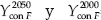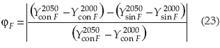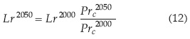 = productividad del cultivo calculada con la ecuación (3) para los años 2050 y 2000, respectivamente, considerando la alteración de fertilidad del suelo agrícola;