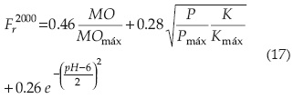 Donde pH y MO, P, K son los valores modales de pH, contenido en el suelo de materia orgánica (MO) y formas disponibles para el cultivo de fósforo (P) y de potasio (K), típicos para los terrenos irrigados con el mismo cultivo y con el mismo valor del índice climático IHT para inicio del siglo XXI; MOmáx, Pmáx y Kmáx son valores máximos observados de MO, P y K entre todos los terrenos estudiados. La ecuación (17) es conveniente, porque en forma explícita establece la relación entre el índice integral de fertilidad del suelo y la relativamente limitada información sobre las propiedades del suelo disponibles en bases de datos existentes (INEGI, 2004).