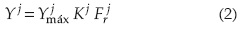 Donde Yj es la productividad agrícola (kg ha-1) en un sitio de referencia para las condiciones climáticas a principios del siglo XXI (j=2000) o estimadas en un periodo futuro (j=futuro); Yjmáx es el rendimiento potencial máximo (kg ha-1), correspondiente a los mismos escenarios climáticos y depende de los valores mensuales de la temperatura del aire, radiación fotosintéticamente activa y las características fisiológicas del cultivo; Kj es un índice hídrico adimensional que caracteriza la disponibilidad de agua en el suelo para los cultivos; Fjr es el índice integral de fertilidad del suelo agrícola (adimensional). Kj y Fjr varían de cero a uno.
