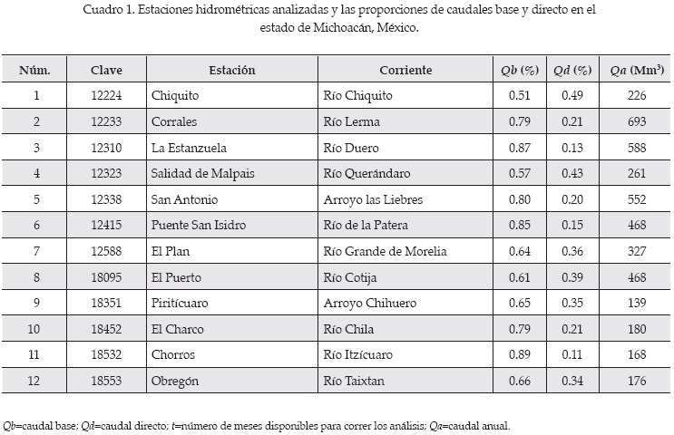 Se analizaron los datos de caudales diarios registrados en las estaciones hidrométricas establecidas en varios ríos del estado de Michoacán y publicados en el programa BANDAS. En total, doce estaciones cumplieron con las características para separar el flujo base y directo. Las estaciones de registro de caudales se encuentran ubicadas principalmente en la zona norte y centro del estado (cuadro 1). Los datos observados contaron con registros diarios entre 13 y 58 años. Se utilizó el programa RORA (Rutledge, 1998) para separar el flujo base y directo a escalas diaria, mensual y anual. Para detectar las tendencias en los caudales se empleó la prueba paramétrica de F y no paramétrica Mann-Kendall. La prueba no paramétrica del método del Seno y la paramétrica de la regresión lineal se usaron para detectar la magnitud de cambio de las variables de la descarga en tiempo (Gilbert, 1987).