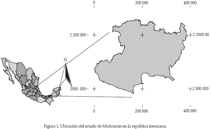 El estado de Michoacán está situado en la región centro occidente de la república mexicana, entre las coordenadas geográficas extremas de 17° 55' y 20° 24' de latitud norte, y 100° 04' y 103° 44' de longitud oeste (figura 1). La extensión territorial que ocupa es de 58 837 km2, que corresponde aproximadamente al 3% de la superficie del país. Los climas predominantes son templado, cálido y de transición. Las temperaturas medias anuales fluctúan desde los 10 hasta los 14 °C en los climas semifríos, y de los 28 a 29.5 °C en los cálidos secos. La precipitación, por el contrario, oscila desde los 400 mm anuales en los climas cálidos secos, hasta los 1 700 mm en los climas templados húmedos. Dentro de los tipos de vegetación representativos se encuentran de selvas, sabanas, bosques templados, bosques semisecos y pastizales. Destacan por su importancia los suelos vertisólicos, luvisólicos, litosólicos y regosólicos.