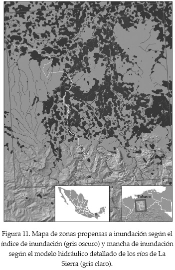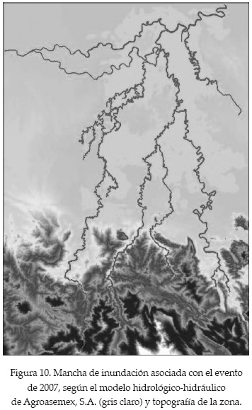 La figura 10 muestra la topografía de la zona y la extensión de la afectación asociada con el evento del año 2007 en la zona de los ríos de La Sierra, según el modelo hidrológico-hidráulico de Agroasemex, S.A. Se puede apreciar la importancia del relieve, pues las zonas altas del MDE no son afectadas. Por otra parte, la figura 11 muestra en diferentes tonos de gris las regiones propensas a inundación, según la metodología aquí propuesta (gris oscuro) y el área simulada con el modelo hidrológico hidráulico (gris claro). Ambas regiones coinciden en su mayor parte de manera satisfactoria, especialmente considerando la gran diferencia que existe en la información involucrada y metodologías empleadas. Las diferencias en las fronteras este y oeste se deben a que las fronteras del dominio en el modelo hidráulico son más limitadas.