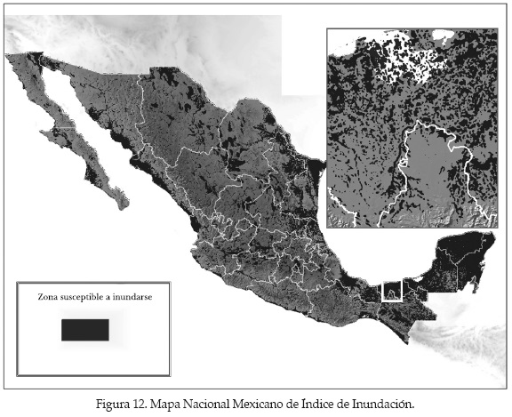 La figura 12 también muestra una ampliación parcial de la Región Hidrológica Grijalva-Usumacinta, donde se puede apreciar que el mapa nacional aparentemente indica que prácticamente toda la región está en riesgo de inundación debido al corto espacio para su impresión, aunque en realidad no ocurre así.