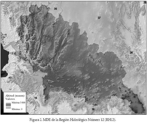 La figura 2 muestra el CEM de la Región Hidrológica Número 12 con cotas que se encuentran entre 0 y 4 660 msnm.