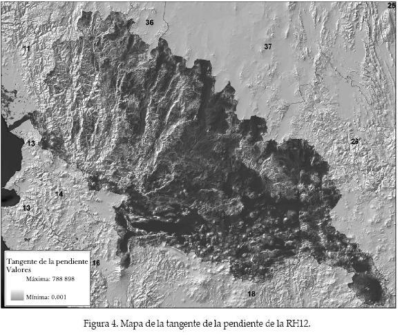 El mapa correspondiente a la tangente de la pendiente, es decir, el denominador del índice de inundación, se muestra en la figura 4. Las zonas más oscuras indican pendientes pequeñas, asociadas con sitios susceptibles de ser inundables por su poca capacidad de escurrimiento por gravedad. Las zonas con pendientes grandes son susceptibles a generar mayor cantidad de escurrimiento y, por lo tanto, son relativamente más propensas a erosión hídrica.