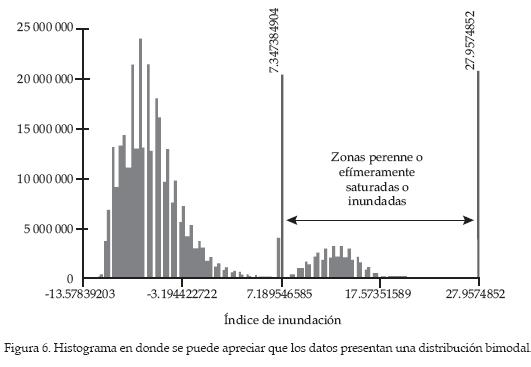 Una vez que se obtienen los parámetros necesarios para determinar el índice de inundación, se estima el índice de inundación de acuerdo con la expresión indicada en la metodología. El índice de inundación resultante es mostrado en la figura 5. Las zonas rojas indican una alta susceptibilidad a inundación, mientras que las gris claro indican lo opuesto. El índice es continuo, y varía entre aproximadamente -14 y 28. Aunque los valores del índice pueden ser empleados para determinar el riesgo de inundación relativo entre diferentes regiones hidrológicas, el análisis puede ser simplificado para una misma cuenca mediante una clasificación binaria del índice de inundación. La clasificación se basa en el hecho de que el índice de inundación tienen una distribución probabilística bimodal (figura 6). Siguiendo la convención encontrada en la literatura, la porción superior del histograma corresponde a regiones susceptibles de ser inundadas, mientras que la porción inferior corresponde a zonas libres de esta amenaza.