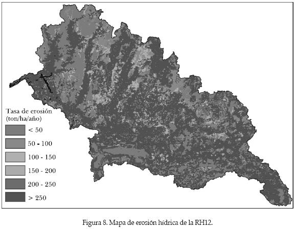 Por último, con el objetivo de corroborar la validez de los resultados por otros medios, se estimó la erosión hídrica con base en la Ecuación Universal de Pérdida de Suelo (artículo en proceso de publicación, Montes et al., 2009). En la figura 8 se muestran los resultados en la Región Hidrológica Número 12. Las zonas susceptibles de ser inundables coinciden con las zonas que presentan un índice de erosión bajo. Dicho resultado es el esperado, pues en estas zonas se depositan los sedimentos producidos en las áreas con altos índices de erosión. Cabe mencionar que con el paso del tiempo, la acumulación de sedimentos provoca que los cauces pierdan capacidad hidráulica, y los lagos o lagunas su capacidad de regulación, propiciando que se incremente el índice de inundación.