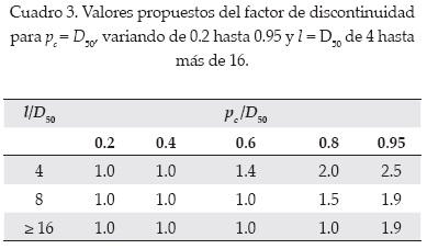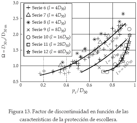 Se propone una metodología basada en el factor de discontinuidad Ω para el diseño de protecciones transversales de escollera. La figura 13 presenta el comportamiento de Ω en función de la protuberancia y de la longitud (ambos adimensionalizados con el diámetro D50) de la protección. Estos resultados se resumen en el cuadro 3. No se encontró ninguna diferencia notable entre los valores críticos de la tensión de las protecciones longitudinales y continuas de escollera.