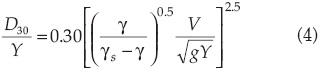 donde V es la velocidad media en la vertical, ϒ es el calado en la vertical y D30 es el percentil del 30% de la distribución granulométrica.