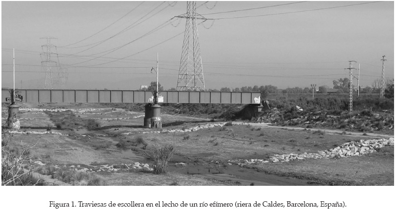 La escollera se utiliza extensamente en la actualidad como medida de protección contra la erosión de lecho y orillas de ríos. Durante las décadas pasadas se ha dedicado un esfuerzo considerable a desarrollar nuevas metodologías para determinar su tamaño, granulometría, espesor de la capa y características del filtro. La mayoría de estas técnicas de diseño consideran el caso más general de un revestimiento continuo (e.g. Stevens et al., 1976; Maynord et al., 1987; Escarameia y May, 1995; Pilarczyk, 1998) o algunas protecciones muy específicas, tales como las utilizadas en pilas de puentes. Por otra parte, parece haber una tendencia de aumento del empleo de escollera en otros trabajos de ingeniería de ríos. Entre estos usos señalamos dos tipos de protecciones no continuas de lecho (Martín-Vide, 2002): 1) protecciones transversales, como por ejemplo umbrales de fondo (también llamadas traviesas) de escollera (figura 1) o de manera semejante las protecciones para las tuberías enterradas; 2) protecciones longitudinales. Ambos tipos se construyen comúnmente enterradas parcialmente, permitiendo un cierto grado de protuberancia. Las tuberías y los servicios que han de cruzar los ríos o discurrir a lo largo de ellos se disponen enterradas en los cauces o en las llanuras de inundación. Las protecciones contra la erosión general como las traviesas (Martín-Vide y Andreatta, 2006) son estructuras transversales y muchas veces se construyeron con escollera.