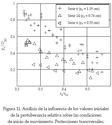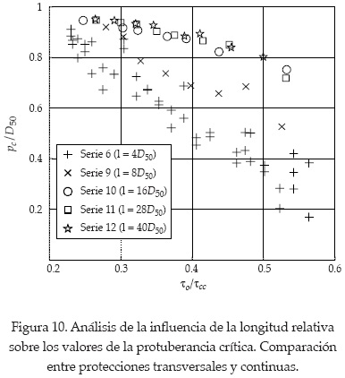 Se observa que al aumentar la longitud relativa, la estabilidad se incrementa considerablemente. Para un valor fijo de la protuberancia relativa crítica, por ejemplo pc/D50 = 0.8, la tensión para una longitud relativa l/D50 = 16 es casi dos veces mayor que el valor correspondiente para l/D50 = 4. Para las longitudes relativas mayores que l/D50 = 16, esta variable parece no tener ninguna influencia sobre las condiciones de inicio de movimiento. La última observación confirma la idea intuitiva de que a medida que aumenta la longitud de la protección, ésta tiende a comportarse como una protección continua. La razón por la que τo/τcc no tiende a la unidad para valores grandes de l es que τo representa las condiciones del flujo aguas arriba de la protección en vez de las condiciones encima de la escollera. Otra característica de la figura 10 es el hecho de que todas las rectas ajustadas intersectan en pc = po = 0.95D50 para τ/τcc alrededor de 0.2 (es decir 20% de la tensión crítica de un revestimiento continuo).