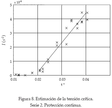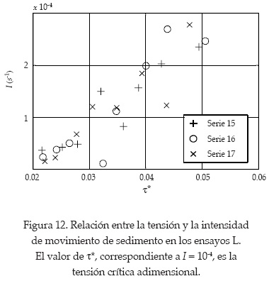 Siguiendo el criterio usado por Shvidchenko y Pender (2000), las tensiones críticas se determinaron como las tensiones sobre el lecho, que produjeron una intensidad de movimiento de sedimento I = 10-4s-1. Las tensiones sobre el lecho fueron calculadas como: