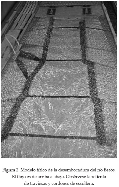 La motivación del presente estudio surgió de los experimentos en un modelo reducido del río Besòs en Barcelona, España. El modelo tenía como objetivo la determinación del riesgo de arrastre de la escollera proyectada, la cual consistía en una retícula compuesta por estructuras longitudinales en los márgenes del cauce principal asociadas con traviesas perpendiculares a éste en el lecho o bien oblicuas en las llanuras de inundación. Además de todos estos elementos "lineales", en el proyecto también se contemplaba un área continua de protección bajo dos puentes. El modelo físico se ha construido a escala 1:55 con fondo fijo (figura 2). Las protecciones han sido representadas por ranuras para ser posteriormente rellenas con piedras de distintos tamaños.