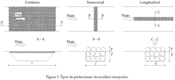 Los experimentos se pueden dividir en tres categorías: continua (C), transversal (T) y longitudinal (L) (figura 3). Para los experimentos con protecciones continuas se ha preparado todo el fondo de los 3 m del tramo de estudio con una capa de partículas de escollera de espesor T = 2D50. Para asegurar el desarrollo de la capa límite se ha fijado la piedra en el primer metro del lecho del tramo de estudio. Se considera que los 200 cm restantes son suficientes para que la protección se comporte de la misma manera que una protección de longitud infinita. Las partículas de escollera se vertían en el tramo de estudio y después se nivelaban con una regla. Durante la nivelación se tuvo el cuidado de preservar las características de escollera "vertida".