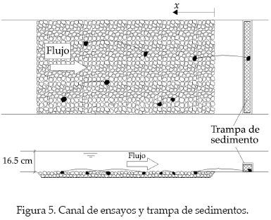 Las tasas de transporte de partículas de escollera se midieron extrayendo el material sólido atrapado en una trampa de sedimento. Una vez recogidas por la trampa (figura 5), se procedía al conteo y pesado de las partículas de escollera. La trampa tiene 75 cm de anchura y 5 cm de altura, y se coloca en el fondo del canal, aguas abajo del tramo de estudio. La perturbación del flujo debido a la colocación y substitución de la trampa durante los experimentos era despreciable. La dependencia temporal de las tasas de transporte puede introducir errores importantes en la determinación del inicio de movimiento. Las medidas de las tasas de transporte se realizaron en diversos intervalos de tiempo. La primera medida fue tomada en t = 40 s y los intervalos de tiempo δt aumentaron gradualmente hasta δt = 5 min en t = 10 min. Después de t = 10 min, todas las medidas se tomaron a intervalos de δt = 5 min. Casi todos los experimentos tuvieron una duración total de una hora. Más detalles de los experimentos se encuentran en Almeida y Martín-Vide (2006).