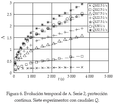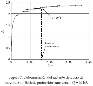 Según lo observado por otros investigadores (Shvidchenko y Pender, 2000; Froehlich y Benson, 1996), la tasa de transporte en experimentos con un lecho compuesto por partículas vertidas no es constante, sino que varía con el tiempo. Las etapas iniciales presentan un transporte más elevado, que disminuye asintóticamente hacia un valor constante. La figura 6 presenta la evolución temporal en siete experimentos de la serie dos (revestimiento continuo). Éste es el comportamiento típico observado en experimentos con lechos continuos y corresponde al proceso de reorganización de la estructura del lecho hacia la condición más estable de un lecho "trabajado por el agua". Los valores constantes de I alcanzados después de esta reorganización son utilizados en este estudio para determinar el inicio de movimiento. Tales valores corresponden a la pendiente de las rectas presentadas en la figura 6, que se ajustan para el intervalo de tiempo en el que las tasas de transporte eran constantes.