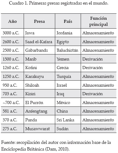 Los primeros registros relacionados con el intento de regular y contener las aguas datan de un poco más de cinco mil años (cuadro 1). Los casos documentados más antiguos corresponden a las presas Jawa, en Jordania, y Kafara, en Egipto, construidas alrededor de 3000 a.C y 2600 a.C, respectivamente. Ambas presas tuvieron como principal objetivo el almacenamiento del agua en épocas de abundancia para su posterior uso en tiempos de déficit.