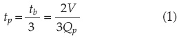 Los mismos autores han demostrado, empleando una solución analítica aproximada de la ecuación adimensional de tránsito en vasos (Aldama y Ramírez, 1998b; Ramírez y Aldama, 2001), que la respuesta de un vaso de almacenamiento sujeto a un hidrograma de entrada, en términos de la elevación máxima de la superficie libre del agua almacenada, es igualmente sensible a variaciones del gasto pico como del volumen de escurrimiento, y mucho menos sensible a variaciones en el tiempo pico. Por tanto, han concluido que una parametrización bivariada en función de Qp y V es suficiente para caracterizar una avenida con fines de diseño de vasos. En este sentido, el tiempo pico, al no ser una variable crítica, puede definirse mediante alguna regla práctica, como por ejemplo la del método del hidrograma unitario triangular, la cual indica que: