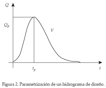 Por otra parte, la mayoría de los hidrólogos concuerdan en que las avenidas se presentan como fenómenos cuya caracterización probabilista debe involucrar otros parámetros, además del gasto máximo del hidrograma. La información acerca del volumen de la avenida, su duración total, tiempo al pico y la forma del hidrograma son esenciales para la toma de una decisión correcta. Sin embargo, el problema de asignar un periodo de retorno al hidrograma completo de la avenida de diseño aún no ha sido resuelto completamente. Al plantear una parametrización de hidrogramas mediante un número finito de sus características más importantes, el problema se reduce a manejar una distribución de probabilidad multivariada de las mismas. La parametrización más simple de un hidrograma debe involucrar por lo menos el gasto máximo o gasto pico (Qp), el volumen de escurrimiento (V) y el tiempo pico (tp) (figura 2).